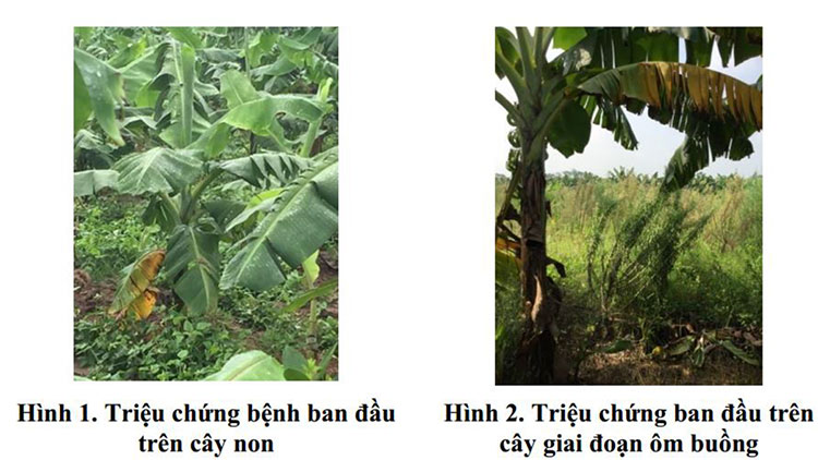 Cây chuối bị nhiễm bệnh thường có hiện tượng vàng từ lá già bên dưới sau đó lan dần lên các lá non, triệu chứng vàng phát triển từ bìa lá và lan vào hướng gân lá. Lá bị bệnh thường héo, cuống gãy và lá treo trên thân giả, đôi khi cuống lá cũng bị gãy ở phần giữa phiến lá. Trên cây bị bệnh, các lá già bị héo khô quanh thân giả, chỉ còn một số lá đọt xanh và mọc thẳng, các lá đọt này có màu xanh nhạt hay hơi vàng hoặc bị méo mó, nhăn nheo, cuối cùng cũng bị héo úa. Cây bệnh chết nhưng thân cây không bị đổ, các bẹ ngoài bị nứt dọc, các chồi con vẫn phát triển từ thân chính nhưng sau đó cũng bị héo rụi. Cắt ngang thân giả bị bệnh sẽ thấy các bó mạch bị đổi màu nâu vàng, cắt ngang thân thật (củ chuối) các mạch có màu đỏ nâu và bốc mùi hôi. Bệnh gây hại tập trung tại vùng chuối trồng từ 3 năm trở lên, vùng trồng lâu năm thì tỷ lệ cây bị bệnh càng cao, bệnh phát sinh gây hại trong bất kỳ giai đoạn sinh trưởng của cây chuối biểu hiện rõ nhất ở giai đoạn cây chuối ra hoa và phát triển quả non.