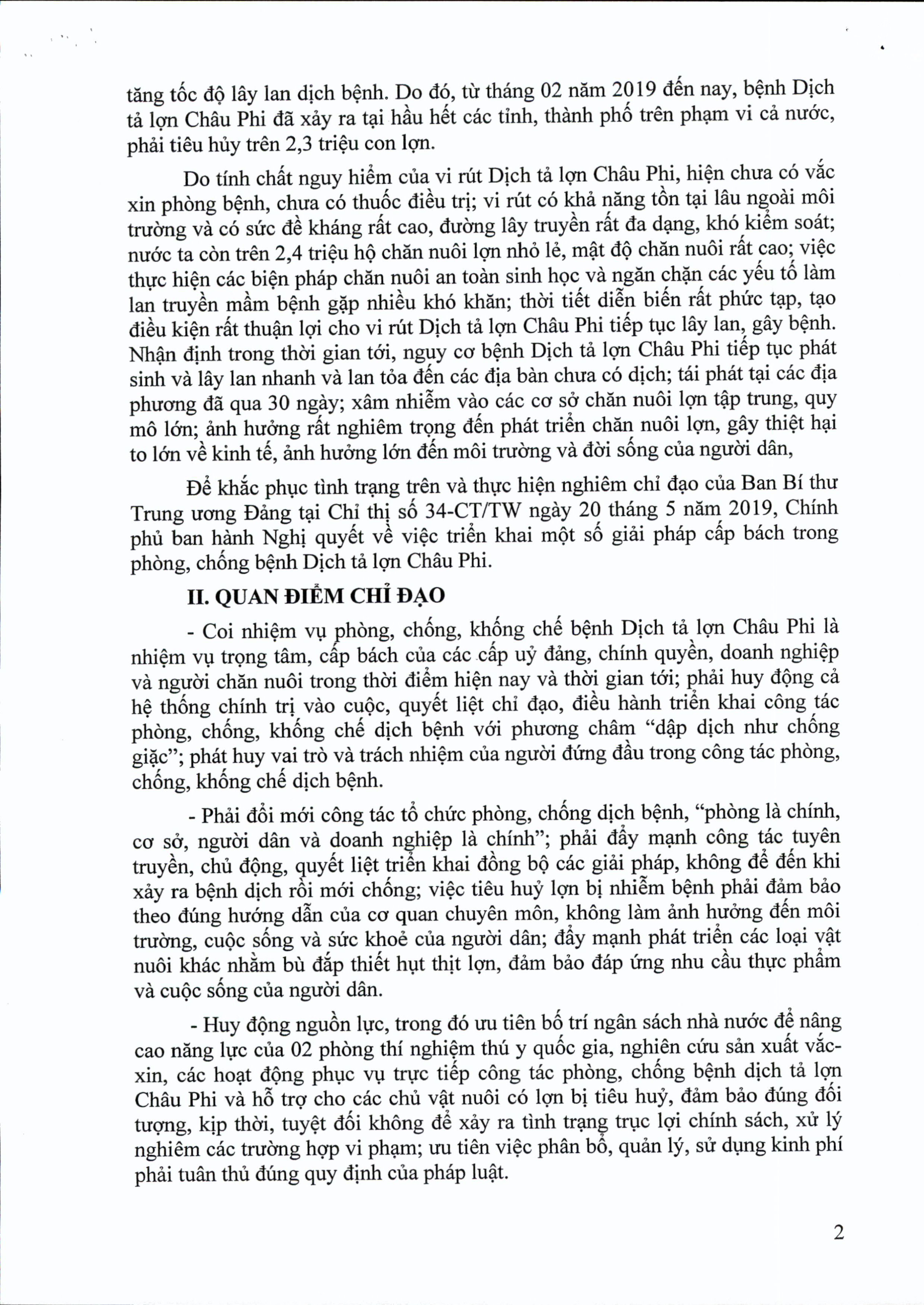 Chính phủ vừa ban hành Nghị quyết 42/NQ-CP về việc triển khai một số giải pháp cấp bách trong phòng, chống bệnh Dịch tả lợn Châu Phi theo tinh thần chỉ đạo của Ban Bí thư Trung ương Đảng tại Chỉ thị số 34-CT/TW ngày 20/5/2019.
