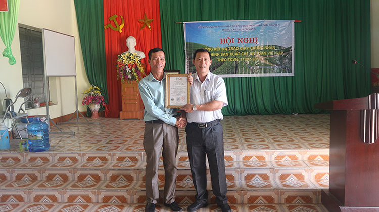 Ông Nguyễn Đình Thông, Phó Giám đốc Trung tâm Khuyến nông trao giấy chứng nhận VietGAP cho Tổ hợp tác Sản xuất chè an toàn Làng Chiềng